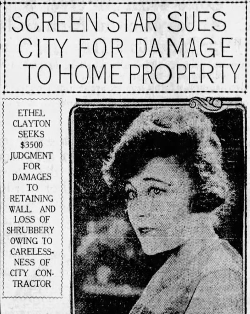 While Clayton still resided at 2119 Fairfield Avenue, the city was fixing the road in front of her home and a 9 foot ditch caused a 10 foot retaining wall to cave in, endangering her house. In 1926, Ethel Clayton won a judgment of $2,700 for damages to her property during the construction of a sewer in 1923. However, a city attorney filed a petition to the supreme court to reverse that decision, but it did not appear to go anywhere.
