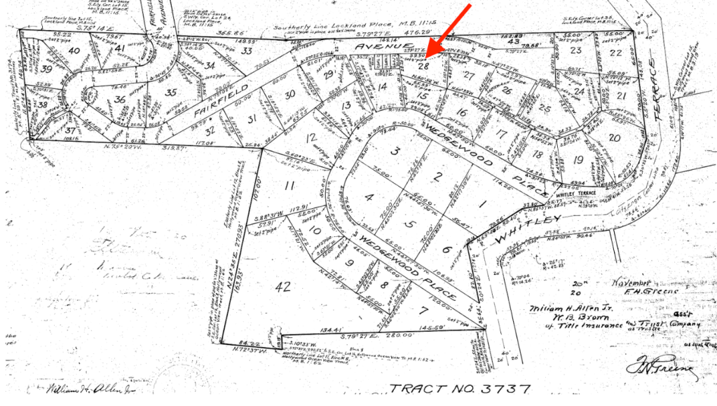 2119 Fairfield Avenue was built in 1920 by M.G. Norris, of the R.E. Whitley Company, the sales agent who made “Whitley Heights Famous” according to local newspapers in the 1920s. Norris hired a local carpenter named Bartley S. Crammer to build a 34 x 44, one story Mediterranean house on lot 24, Tract 3737 on Fairfield Avenue. As a reference, 2133 Fairfield Avenue, which still exists, is on lot 29.