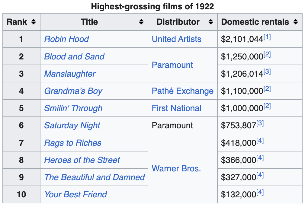 Hollywood 1922. Douglas Fairbanks was the star in the highest grossing film of the year in “Robin Hood”. Other popular actors of the time included; Rudolph Valentino, Leatrice Joy, Harold Lloyd, Norma Talmadge, Conrad Nagel, Wesley Barry, Marie Prevost, Kenneth Harlan, and Vera Gordon. Those who did not make the top 10 list included; Mary Pickford, Marion Davies, Buster Keaton, Wallace Reid, Stan Laurel, and Jackie Coogan. The short film series included those of Charlie Chaplin, Buster Keaton, Laurel and Hardy, and Our Gang. Sid Grauman opened the Egyptian Theatre on Hollywood Blvd with the world’s first movie premiere – Robin Hood, starring Douglas Fairbanks.