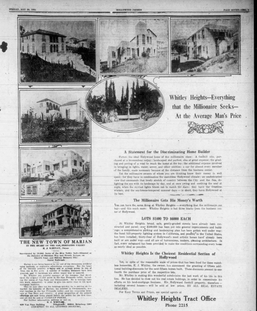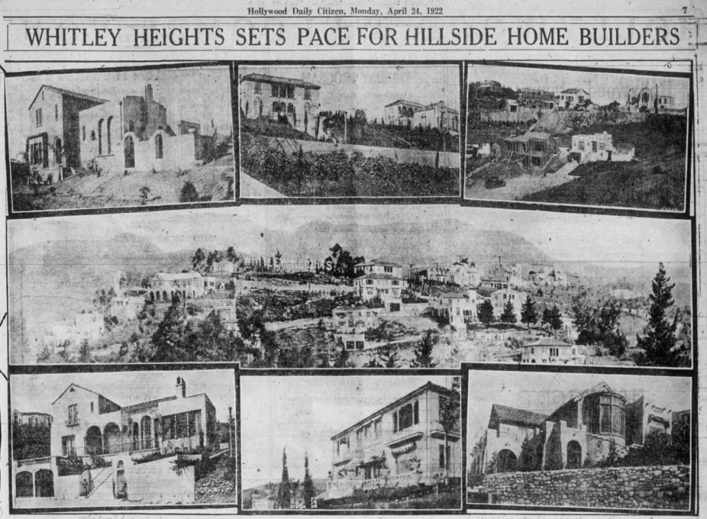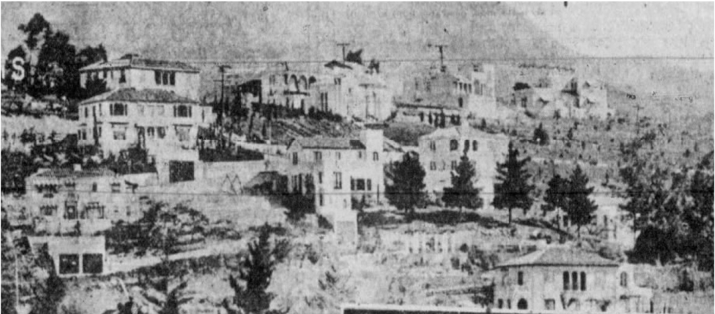 A General View of Whitley Heights together with special views of a few of the 50 splendid residences which help to make this section of Hollywood one of the choicest residential spots and add to the fame of Hollywood as ‘The City of Fine Homes’. A striking answer to the question as to what makes Hollywood and the balance of Los Angeles and the most rapidly growing city of all history was secured recently by the Citizen in making inquiry as to the previous place of residence of the numerous persons erecting the distinctive Spanish and Italian homes on Whitley Heights, the exclusive hillside tract in the heart of Hollywood.