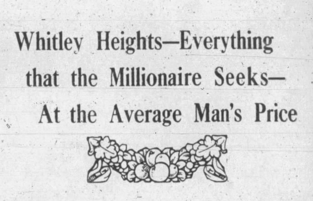 Notwithstanding the extremely high class nature of all the improvements and surroundings in Whitley Heights the prices of lots are very reasonable ranging from $1700 to $2400 net after building discounts, with a very few higher, ranging up to $7500 each. Whitley Heights Park, the newest addition to Whitley Heights, located on Cahuenga avenue between Whitley avenue and Whitley Terrace, is parked with magnificent old palms, and thousands of choice roses and shrubs. Several lots in this tract heretofore reserved from sale will be offered for the first time this week.