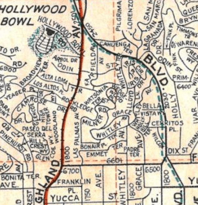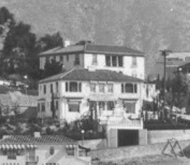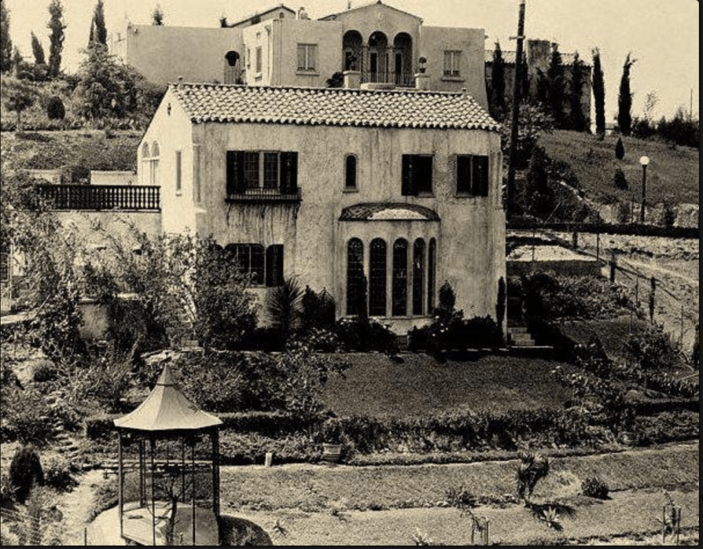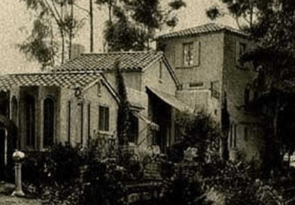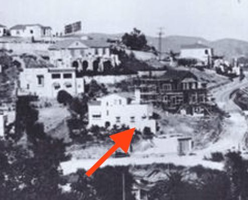 Real estate developer Hobart Johnstone Whitley purchased the hill and named it “Whitley Heights” as early as 1903 when he built the “Pleasure Pavilion” and on April 25, held a flag raising event to show young Hollywood his plans for their newest neighborhood. Perhaps the first homes on the hill would have been built sooner had it not been for a fire in the summer of 1907 that took out all of the trees and other vegetation that Whitley had exported from the Hawaiian Islands and Mexico. By 1910, homes were being built on Odin Street, just off of Highland Avenue, close to the site that would be the Hollywood Bowl. Whitley replaced the trees and began selling off plots of land on the hill. Whitley sent architect Arthur S. Barnes to Europe so he could study the architecture in Spain, Italy and across the Mediterranean so he could replicate the look in Whitley Heights. A.S. Barnes built a one room “Whitey Heights Tract Office” was built at 6669 Whitley Terrace in 1920 for Mr. Whitley (pictured below). The office would later be torn down and the land used to build the “Pike House” in 1952.