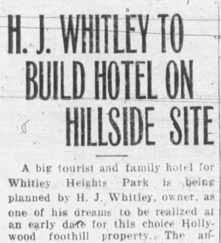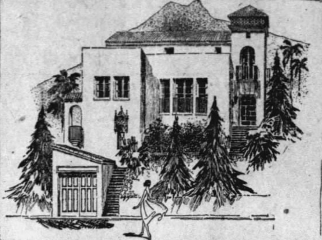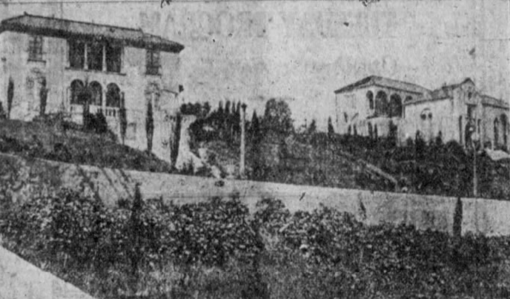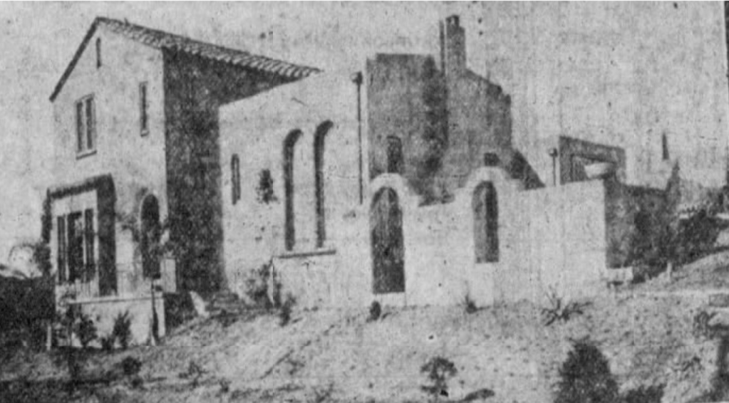 In March of 1921, oilman George Betts purchased a plot of land on Grace Avenue for $5,300 and then built the 3 bedroom Mediterranean home located at 2025 Grace Avenue (below). Betts was now living across the street from Francis X. Bushman. That same month, actor Vesey O’Davoren and his wife bought the house on 2049 Las Palmas Avenue and had moved from England and were temporarily living at Hotel Hollywood. In April, writer Clara Orwig bought the lot on 2146 Fairfield Avenue and built a home. One month later, the final lighting of the streets was completed and a celebration ensued complete with a bonfire and fireworks. Whitley told attendees that most of the 120 lots in Whitley Heights had been purchased and he wanted to build an “ultra modern family” hotel that would surround 20 villas.
