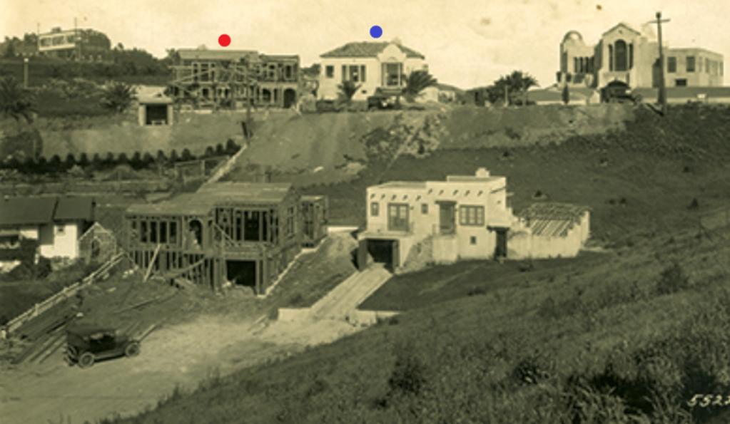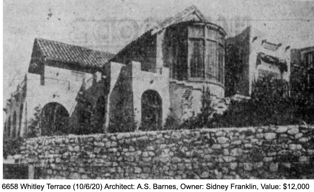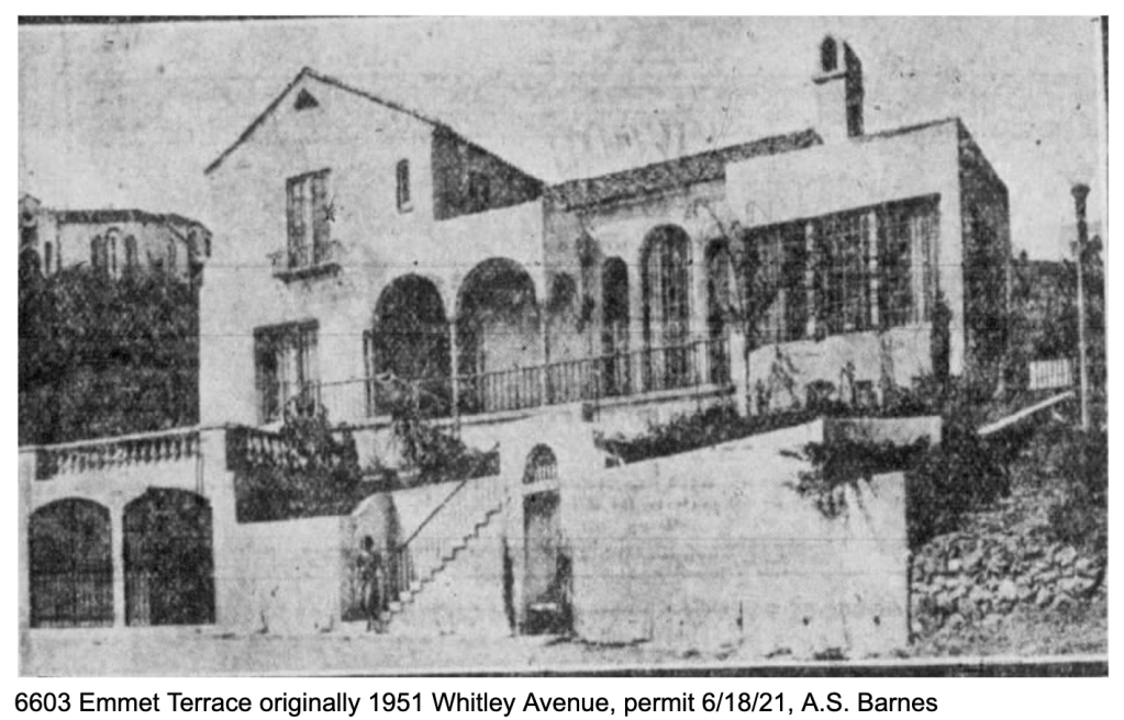 Six residences on Whitley Terrace and Fairfield Avenue were in the process or recently built below. 6797 Whitley Terrace (red dot) was built by Barnes for owner Charlotte K. Miller in 1922 with a value of $7,000. The house was later relocated to 13770 Polk Street in Sylmar in 1950 where it would later be demolished. Miller also hired Barnes to build 6793 Whitley Terrace next door (blue dot), which would be relocated to Huntington Beach in 1950 and still remains today. 6797 Whitley Terrace (far right) was built in 1921 by owner Edwin Anderson and architect A.S. Barnes which would later be demolished.
