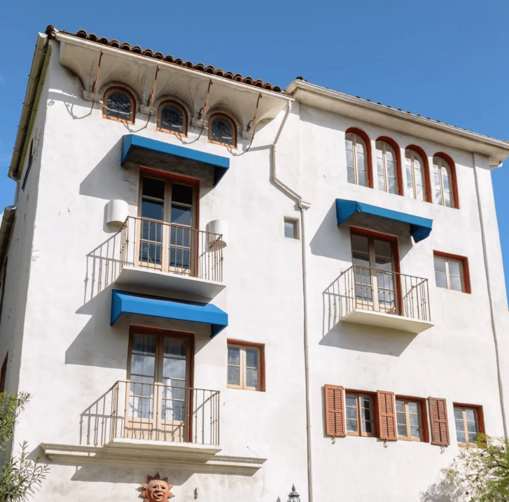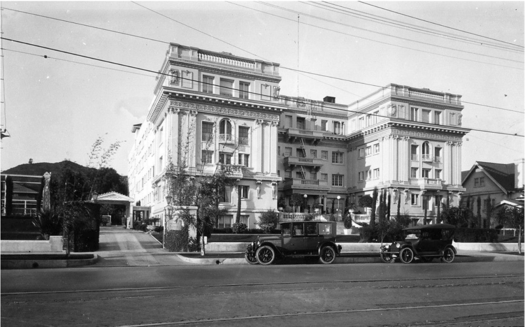 Larkin and Catherine Brown remained at this house in Whitley Heights until Larkin’s death in 1942. In 1934, Clarence Brown was listed as living at this residence while he was married to Alice Joyce. They then found a home on Beverly Drive. Perhaps they were between residences. When Brown first moved to Los Angeles, he rented an apartment at the Garden Court Apartments located at 7021 Hollywood Blvd. in 1920, which were demolished in 1984 (see below). Designed by architect Frank S. Meline in the Beaux Arts style and built in 1917, the classical structure consisted of 190 two and three room suites composed of hardwood and tile. The apartment building was intended to accommodate prominent members of the movie industry. Among its residents were Louis B. Mayer, Mae Murray, and John Gilbert.