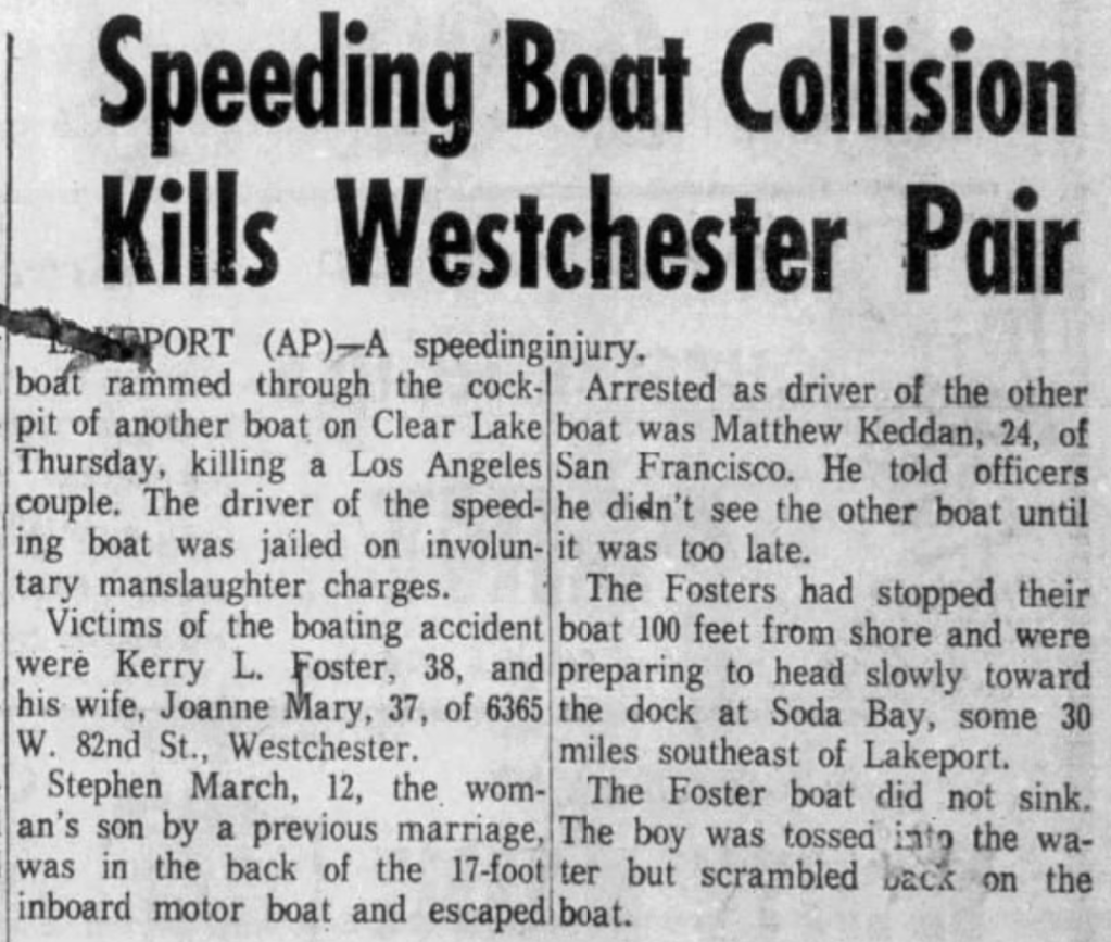 Kerry eventually found true love and remarried in 1956. However, tragedy struck the family in 1963. Thirty-eight year old Kerry and his second wife, thirty-seven year old Joanne, were killed in a boating accident in Clear Lake. They stopped their cabin cruiser 100 feet from the shore in Soda Bay, which was hit by another boat driven at excessive speed by a 24 year old who was charged with involuntary manslaughter. Joanne’s 12 year old son was also on the boat, but was not near them and escaped serious injuries.