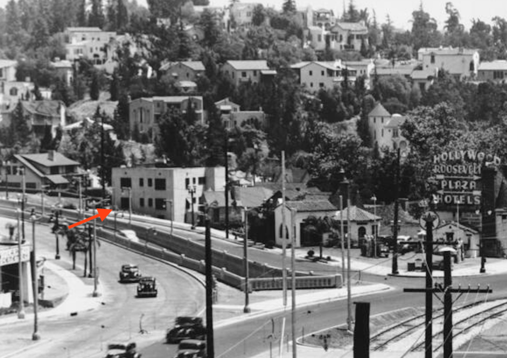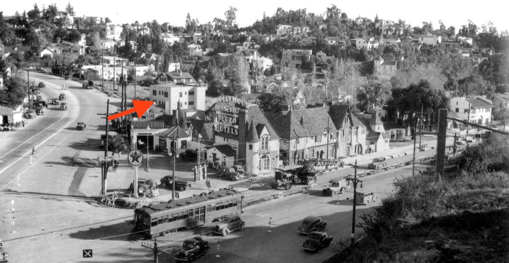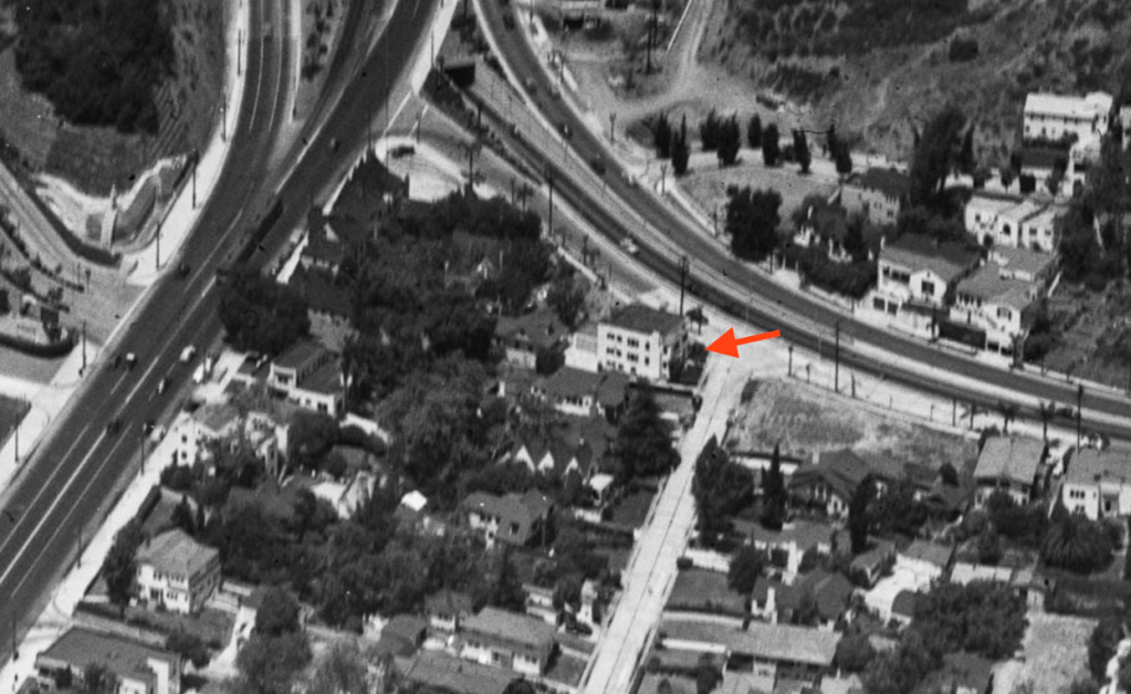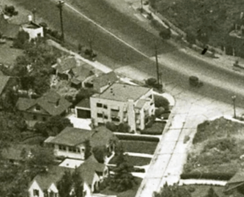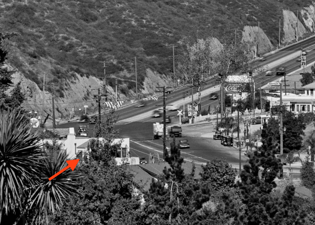 This duplex was located close to the Cahuenga Pass as seen below, the second floor of the property is seen from the hills of Whitley Heights near the intersection of Cahuenga Blvd. and Highland Avenue. A Texaco gas station sign is seen just behind the residence, which used to be next to the French Village. Across the street used to be the sign for The Berries Dining Room with the caption “Drink Coca-Cola” underneath, located at 2502 Cahuenga Blvd. Next to the restaurant, used to be the Los Angeles Pet Cemetery office at 2500 Cahuenga Blvd.