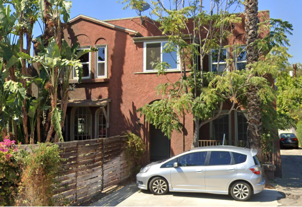 2313 Fairfield Avenue is a duplex that was built on the corner of Fairfield Avenue and Cahuenga Blvd. at the foot of Whitley Heights before that section was demolished to make way for the Hollywood Freeway in the early 1950s. It was just around the corner from the French Village and Hollywood Bowl when it was built in 1923 by owners Edward and Sarah Hudson who lived in the rear of the property at 2311 Fairfield Avenue (the bungalow is seen below just behind this two story duplex).