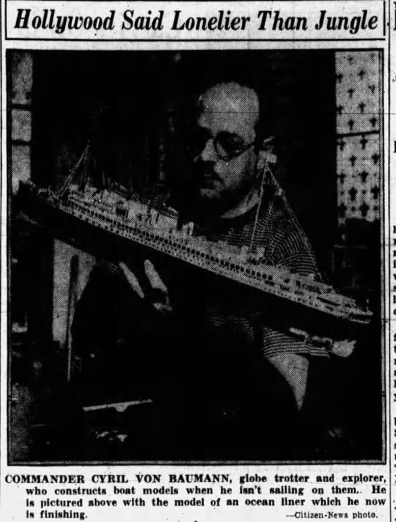 After Von Baumann, took off from his second wife, he moved to Hollywood so he could publish a tell-all book. In late 1935, he rented 2175 Fairfield Avenue and gave an interview to a Los Angeles newspaper claiming he felt lonelier than being in a deepest jungle but moved to Los Angeles in order to write a book about his South American explorations. Von Baumann told the reporter that he would retell his stories of “hunting lions in Ethiopia”, “fighting pirates in the Yangtze” and “seeking buried treasure of the Incas”, “saving lives as sea” and “safari riding in the Tibet”.