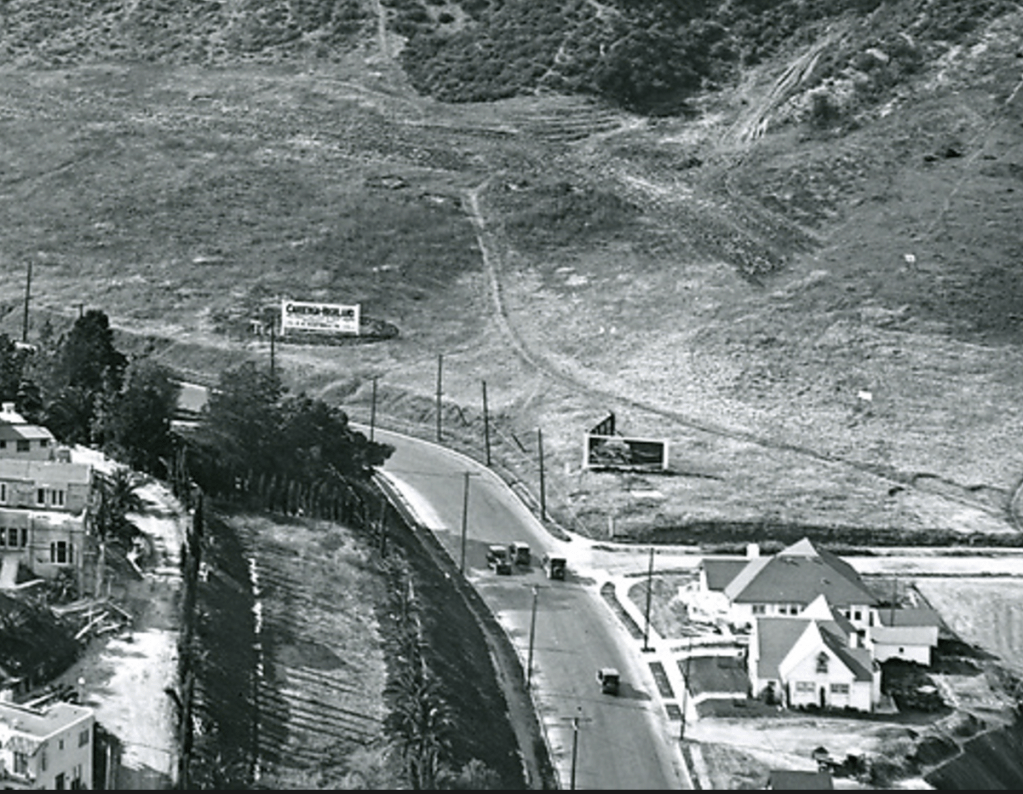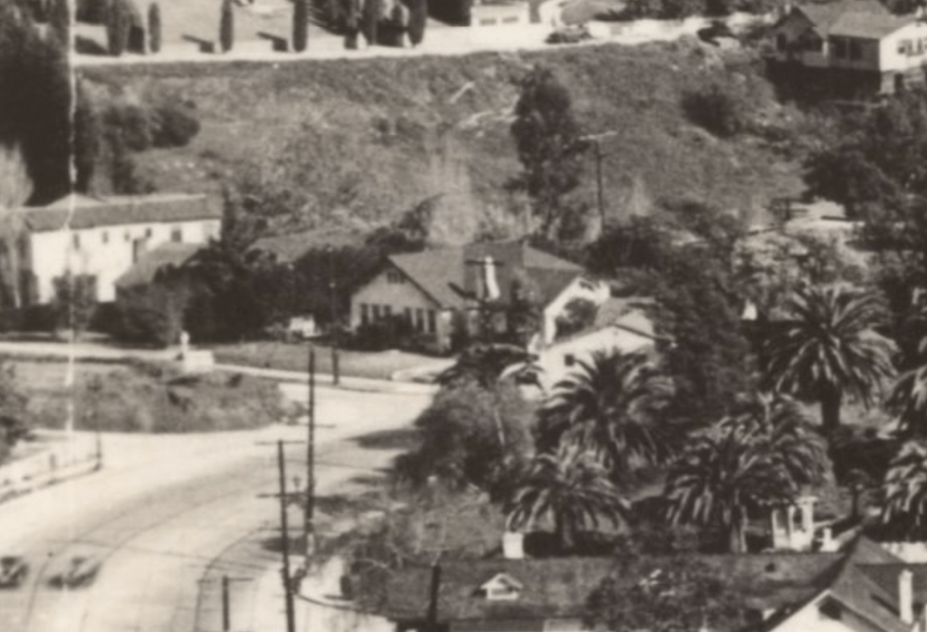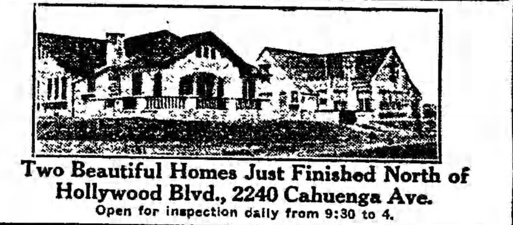 The above aerial photograph was taken at the corner of Cahuenga Boulevard (formerly Avenue) and Odin Street circa 1923. To the left are the beginnings of Whitley Heights Park being built (Iris Circle). To the right were two residences which were both on lot 4 of tract 3456, and were completed in 1921 by Alcorn Construction. They bought the entire lot and also built two residences on the rear of the lot on Odin Street. They advertised 2240 and 2242 Cahuenga for sale in the August 21, 1921 edition of the Los Angeles Times.