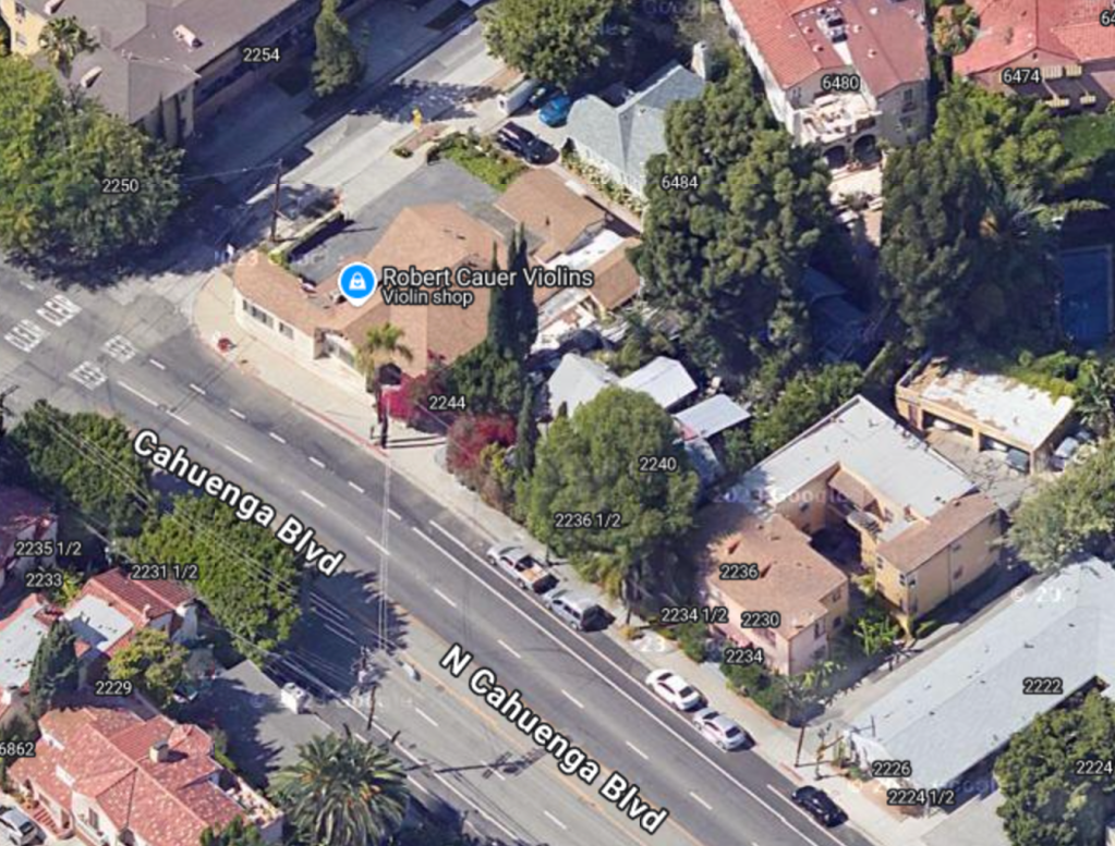 2242 Cahuenga Blvd. is currently the location of Robert Cauer Violins which was established in 1980. The home was originally built as a 6 room single family residence with a private garage. In 1936, a one room store was added to the front of the house. In 1974, the garage was converted into a storage unit and a new garage was built in the rear of the property. The property has had multiple owners and renters throughout the years.