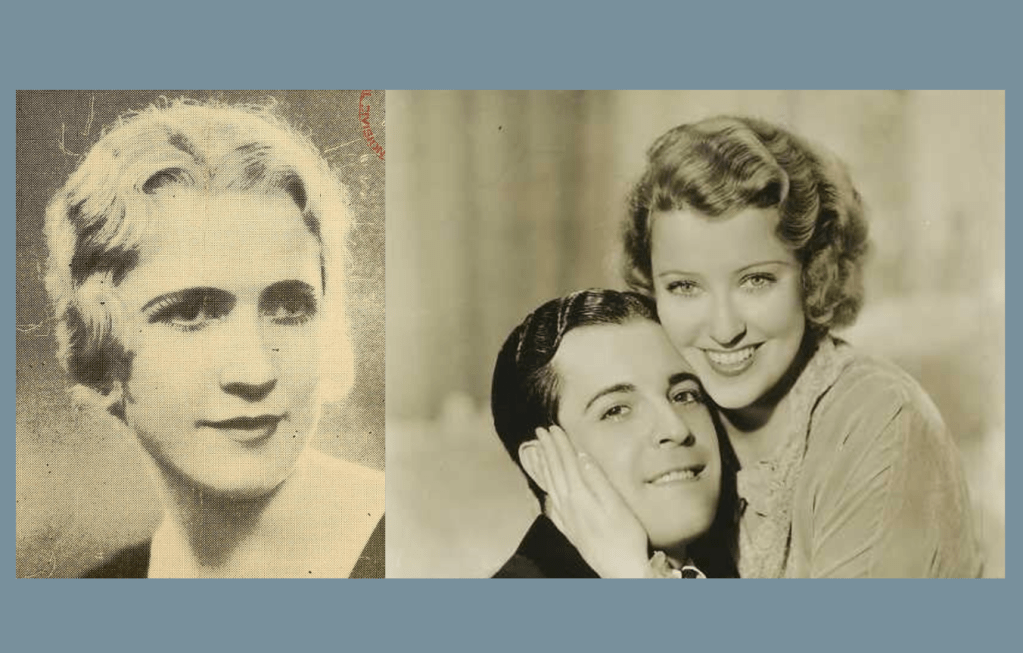 For the next year, Mrs. Dulce Mooman Briant attempted to revive her once promising singing career at a local church, performed in a benefit show and local play, but was miserable with a stagnant singing career and a husband who was often gone. In December of 1933, she decided to leave her husband and changed her stage name to “Dulce Day”. She was hired to perform a solo at The Bowery in Los Angeles. It turns out that Dulce Day was a dead ringer for actress Jeanette MacDonald. In 1934, MGM hired her as a stand-in for the actress in the film, “The Cat and the Fiddle” which also starred Ramon Navarro and Frank Morgan. Below, Dulce Day (left) and Jeanette MacDonald and Ramon Navarro in “The Cat and the Fiddle” which was released in 1934.