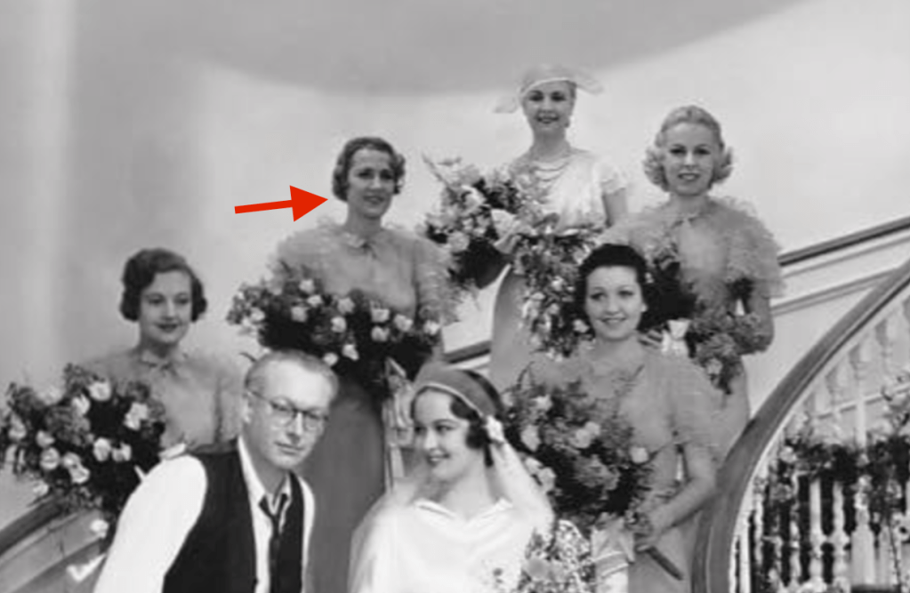Following her stand-in part, Dulce picked up a part as a nurse for Columbia Pictures in the film “Jealousy” starring Nancy Carroll in 1934, a bridesmaid in “Vagabond Lady” starring Robert Young in 1935 for Hal Roach Studios, and a customer in “Our Relations” with Stan Laurel and Oliver Hardy in 1936. Dulce worked with another aspiring actress, Gertrude Astor who was also an uncredited customer in the film. Below, Day as part of the wedding party in “Vagabond Lady”.