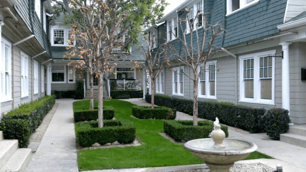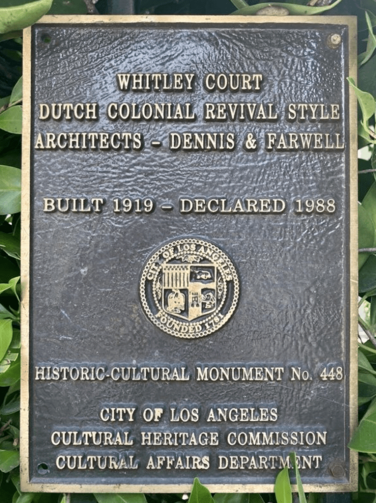In 1974 Whitley Courts Apartments were converted into both residential and office spaces. Whitley Court was designated a Historic Cultural Monument (HCM #448) by the Los Angeles Cultural Heritage Commission in 1988, and was listed in the National Register of Historic Places in 2004. During the 1992 riots, fires were burning close to the property and residents protected the structures with hoses, saving them. At the time, one of the owners said, “These buildings are important. You can’t replace a historic building. When it burns, you lose it forever.” So true, even when buildings are demolished purposely for newer ones!