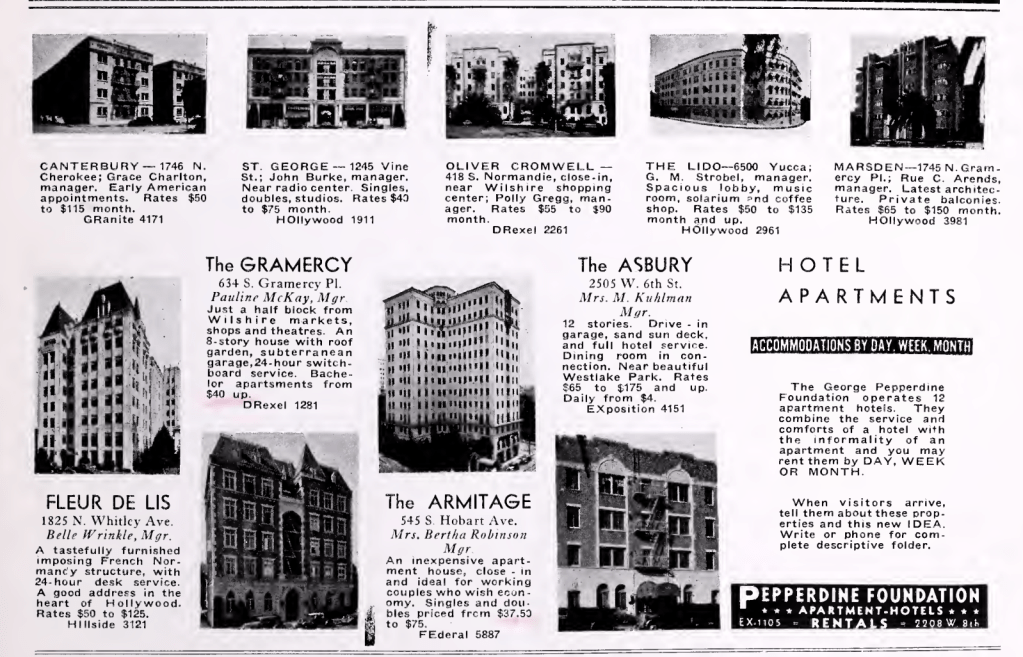 In 1937 1825 North Whitley Avenue was sold to the George Pepperdine Foundation for $200,000. Pepperdine had owned several other apartment buildings in Los Angeles and used the rentals to support the new George Pepperdine College. Pepperdine also acquired The Ravenswood a few months later and used the slogan, “Foundation Apartments: The finest in every price class!”