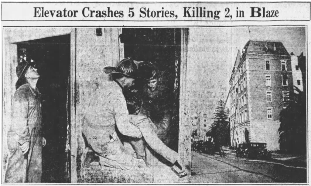 Scandal hits The Fleur de Lis in November of 1931. A fire started on the roof of the building and spread down to the top floor. After the firemen took control of the fire, they did not realize Dr. and Frances Moulton went back up to the fifth floor where they had been living for only a month to see the damage. When they entered the elevator to go back down, the safety rope, which was damaged from the fire, broke, causing the main cable to snap and they fell four floors down to the bottom. Both died hours later in the hospital. They were the parents of longtime stage actor, Harold Moulton.