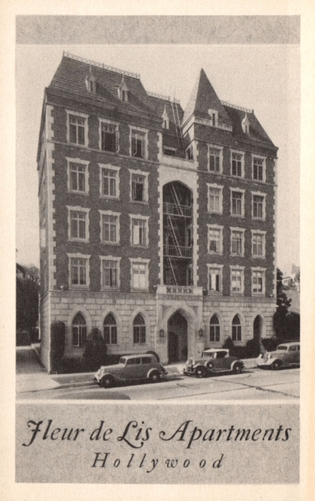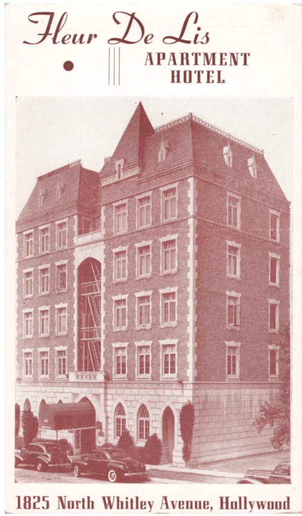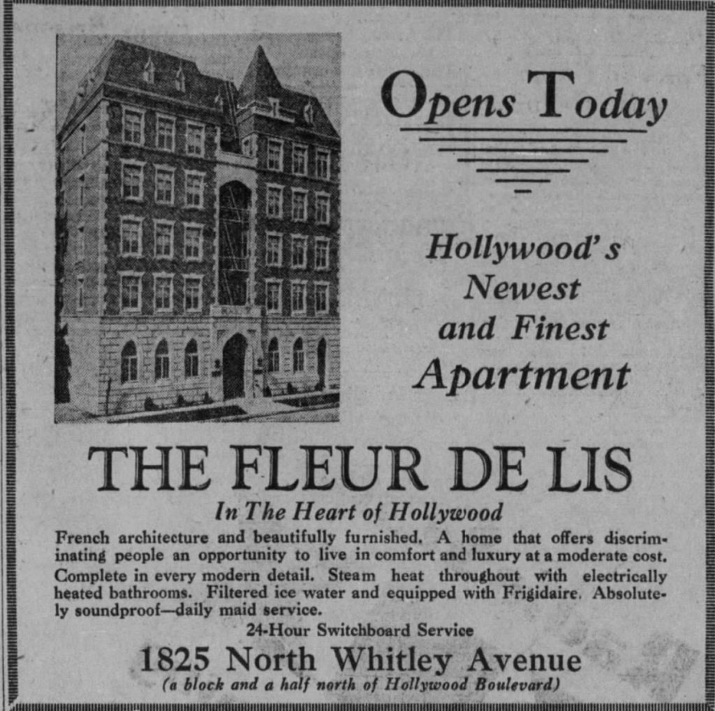 On November 10, 1928, the Fleur de Lis Apartments officially opened as “Hollywood’s newest and finest apartment” in the heart of Hollywood. The owners promoted steam heat throughout, filtered ice water, soundproof walls, daily maid service, and a 24 hour switchboard service. The residence attracted Hollywoods film stars as soon as it opened.