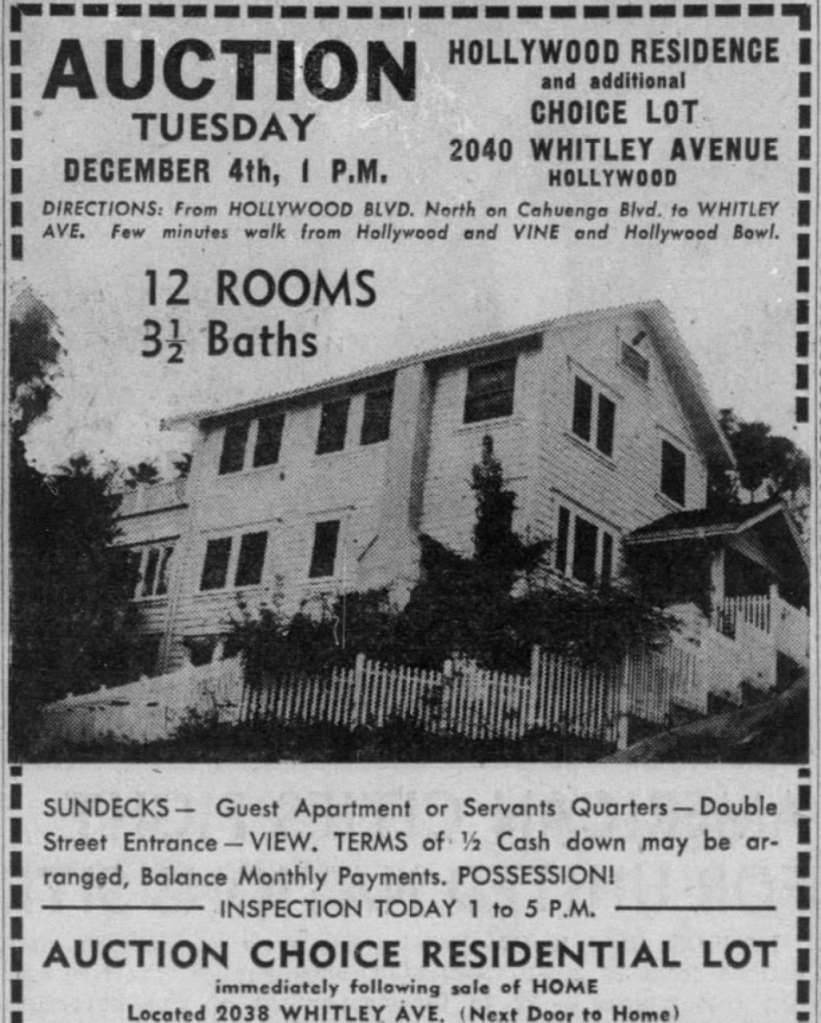 In 1923, the Wheelocks added a store room, sun porch, and widened the existing screen porch. In 1939, they built a new garage (relocated the original garage from the adjacent lot) and another bedroom and bathroom improving the single family residence to a three bedroom, three and a half bathroom home. The Los Angeles Assessor’s office recognizes the property as 6544 Bella Vista Way. However, after the house was auctioned off in 1945, the owner began using the address of 2040 Whitley Avenue.