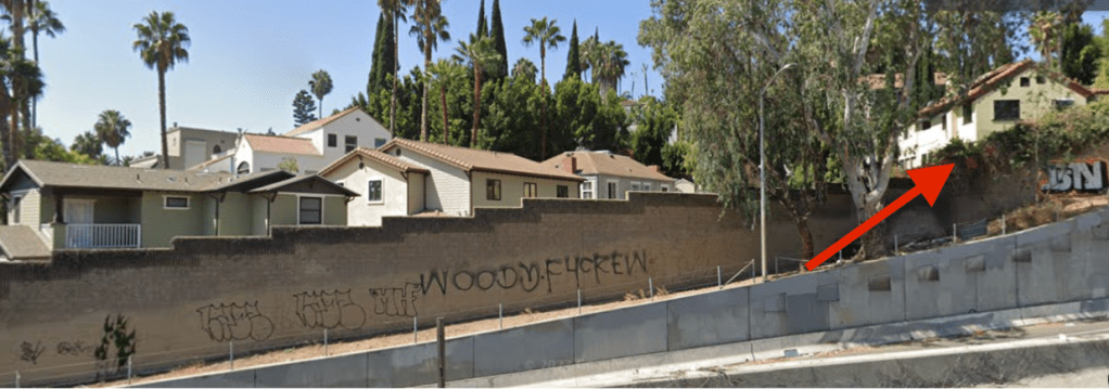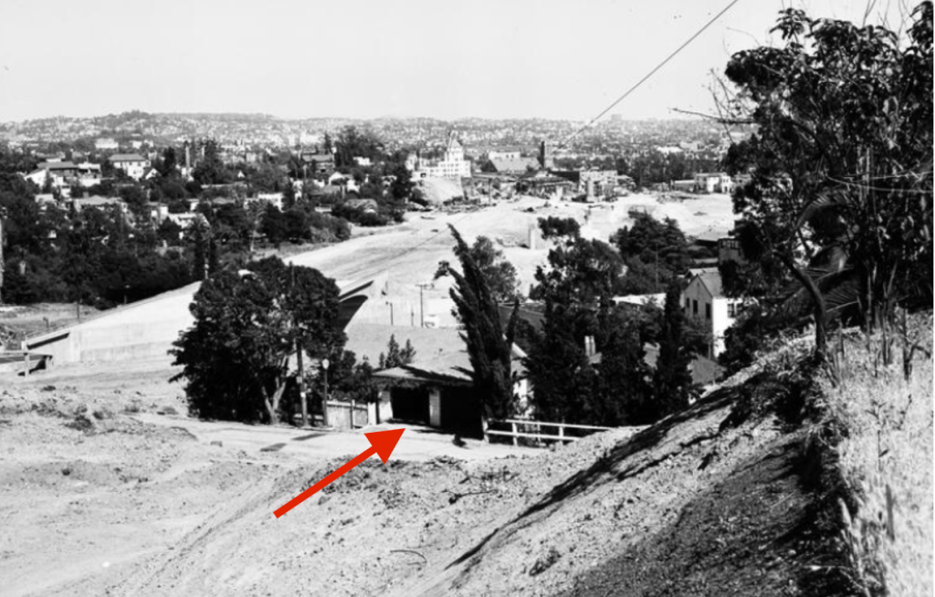 Bella Vista Way used to be a foothill street with a cul-de-sac, lined with one- and two-story bungalow houses that backed up to Whitley Avenue (formerly Curlew Street) and was accessed off of Cahuenga Avenue (now Boulevard). Several of the homes survived the Hollywood Freeway construction during the 1950s- four homes remain on Bella Vista Way, including this property, while some were relocated to other neighborhoods in Los Angeles.