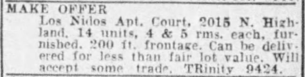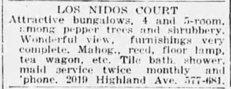 Los Nidos Court, advertised as “attractive 4 and 5 room bungalows, among pepper trees and shrubbery” were furnished apartments and even had maid service twice per month. Barker rented the bungalow to widows and at times, movie stars.