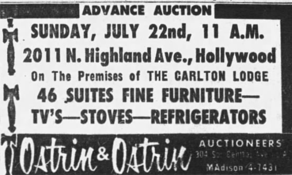 In June of 1962, both Carlton Lodges were sold and an advertisement appeared to auction off all of the Hollywood location furniture and appliances: