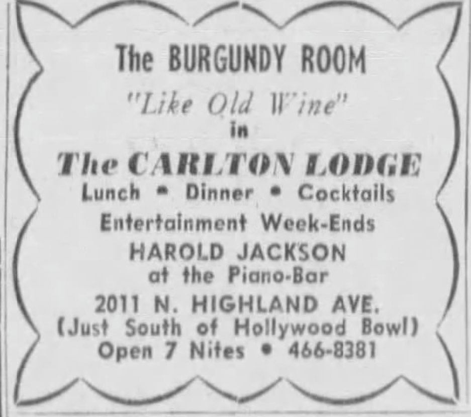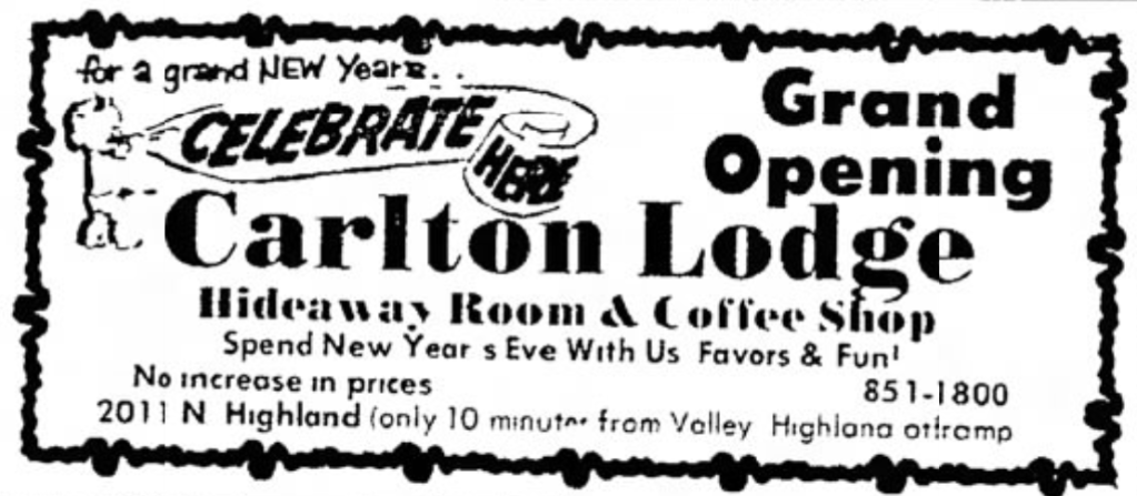 In 1968, Carlton Lodge reopened with the Burgundy Room which featured musical entertainment on the weekends.