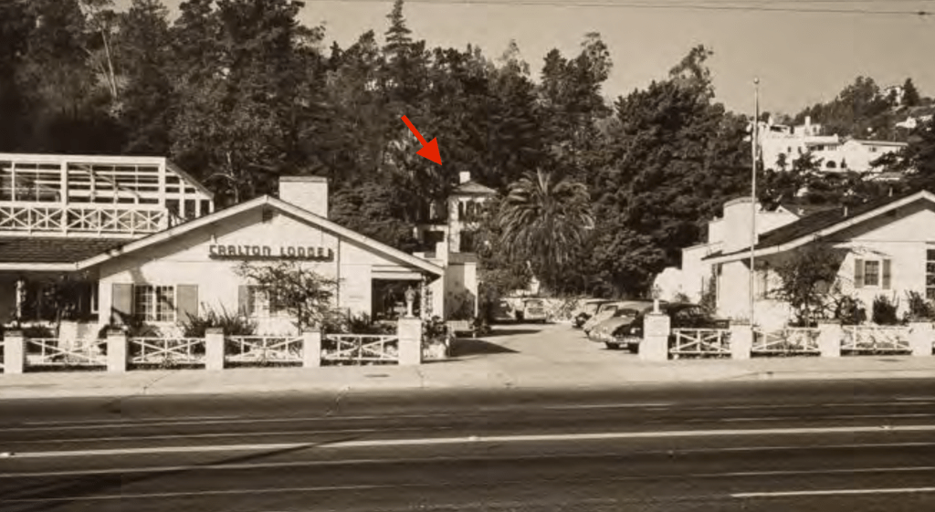 Bertha Barker, widowed wife of O.J. Barker, one of the three brothers who started Barker Brothers furniture store, purchased the home and developed the land below into a bungalow court consisting of seven duplexes and called the rental apartments “Los Nidos Court” in 1920. Below the estate can be seen between the Carlton Lodge bungalows circa 1940s.