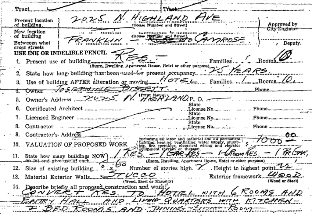 The property exchanged hands several times including to Josephine Bassett who attempted to turn the residence into a hotel in 1946 and was unsuccessful. Below, is the permit that was never used.