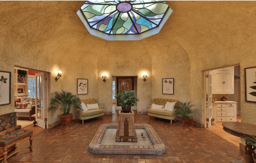 The main house is 3,361 square feet where the front door opens into an octagonal hall which was once an open aired courtyard that was replaced with a covered stain glass skylight. The central feature in the hall is an original Batchelder fountain that is surrounded by a square shallow tile pool. All of the main rooms of the first floor- dining room, original sitting room, family room/library, kitchen, staircase, and back bedroom can be entered off of the central hall.