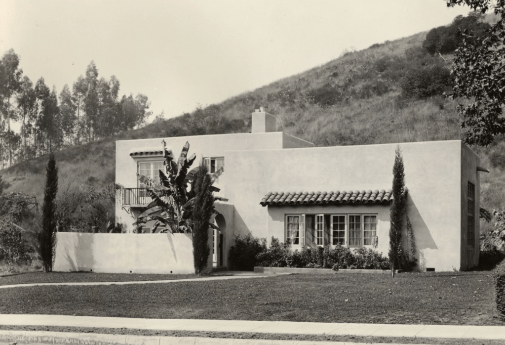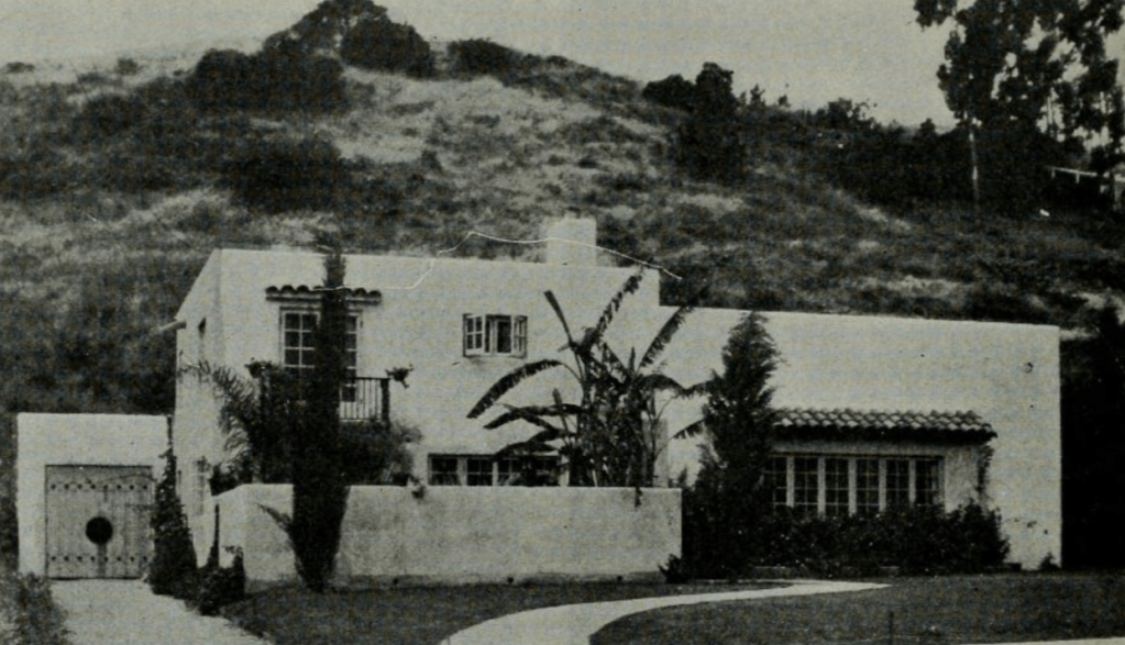 In 1918, landscape painter E. Roscoe Schrader (1878-1960) hired architects Mead & Requa from San Diego to build a Spanish Colonial Revival house on North Highland Avenue close to the intersection of Highland Blvd. and Franklin Avenue. Mead & Requa also built the Krotona Court located 2117 Vista Del Mar Avenue and a residence for Mrs. V. Knudsen nearby in the Hollywood Dell in 1913.