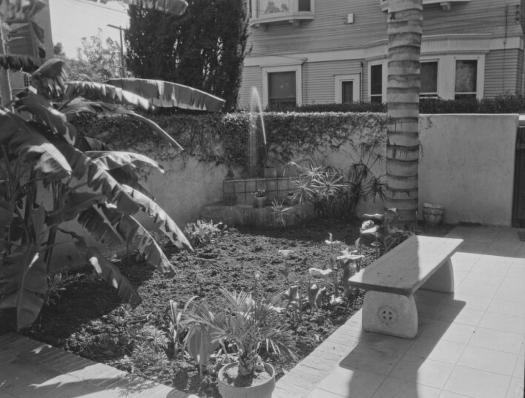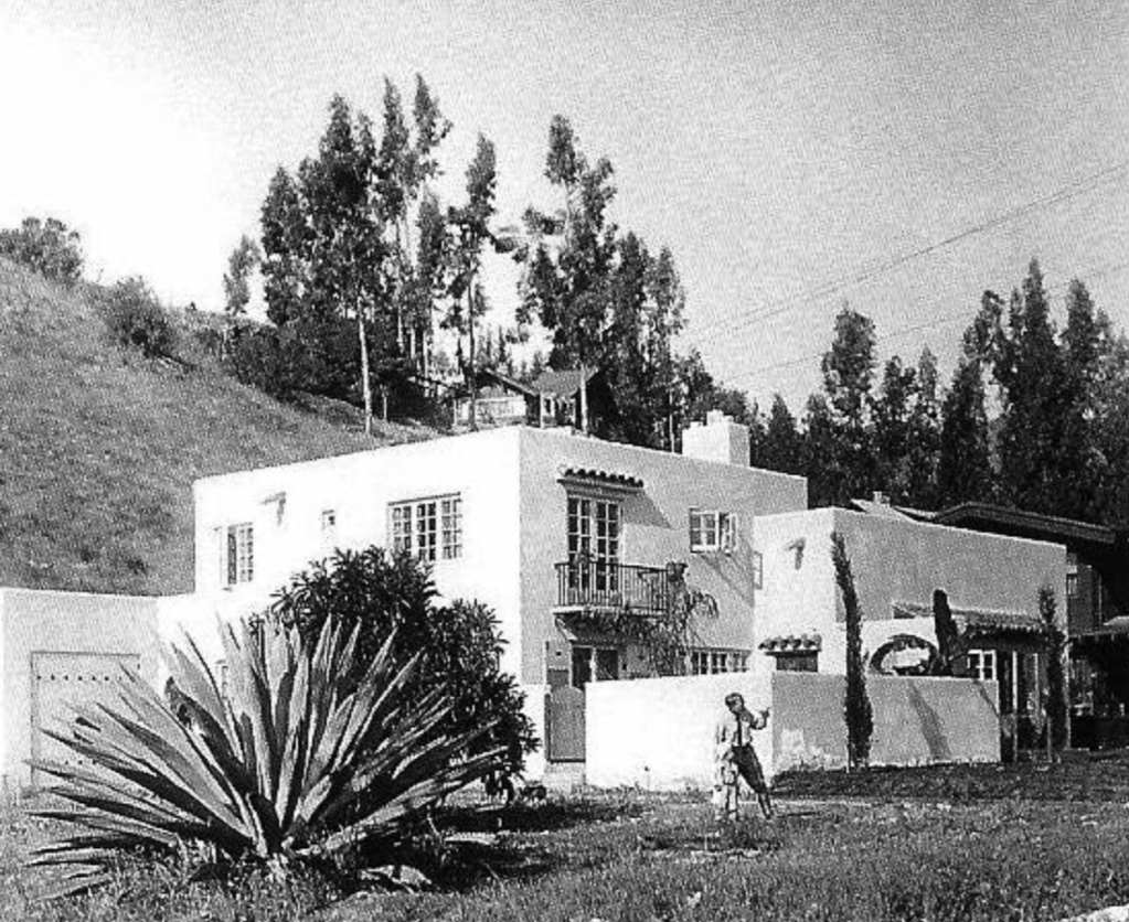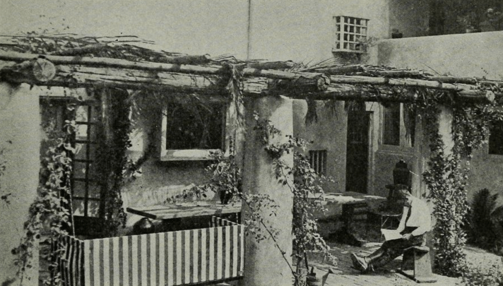 In the front of the home where was a walled garden with a fountain and an archway entrance. The main room on the first floor was Schrader’s art studio with a stairway leading to the second floor balcony with bedrooms beyond. The house was named one of three “best homes in Los Angeles” in the February 1920 issue of House Beautiful Magazine. Below, Schrader can be seen on his back patio.
