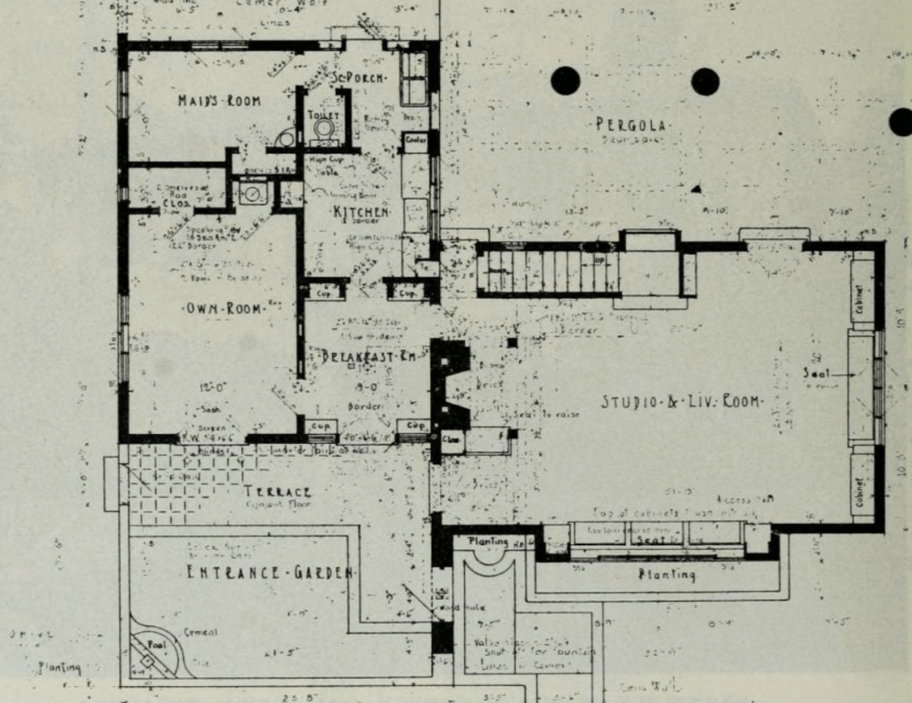 In addition, the Pueblo-inspired home received honorable mention as a notable example of small house architecture by the Southern California Chapter of the A.I.A. (Jennings, Frederick, “Los Angeles and Vicinity,” Architect and Engineer of California, June 1920, pp. 108-109). Below is the layout for the first floor.
