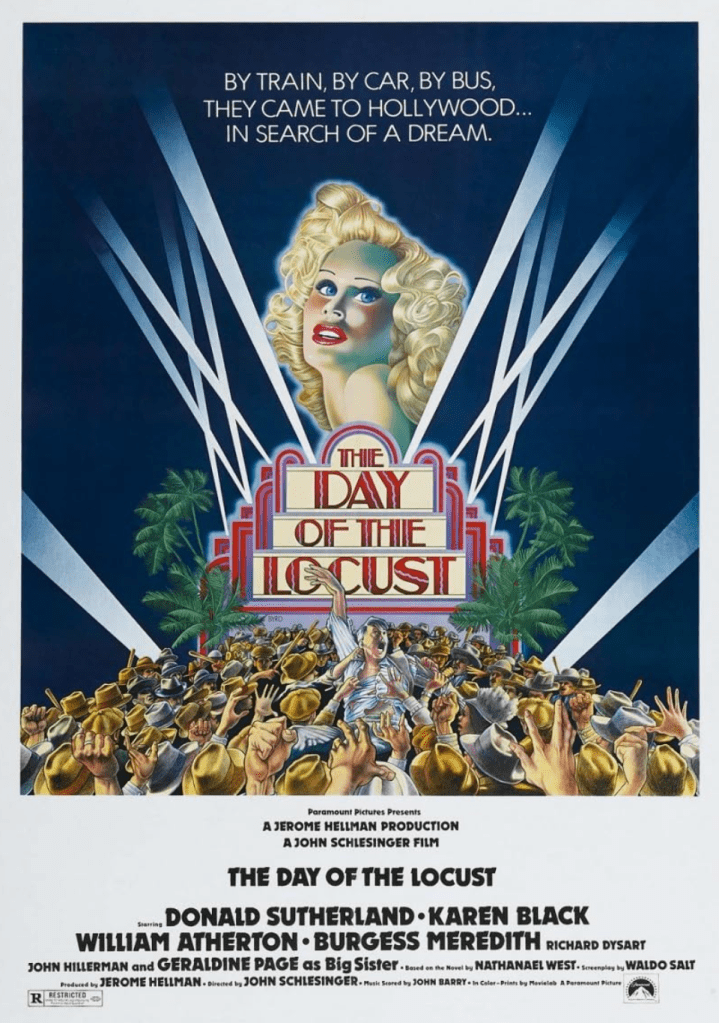 “The Day of the Locust” premiered in 1975 by Paramount Pictures and starred Donald Sutherland, Karen Black, and Burgess Meredith. The story takes place in 1930s Hollywood and is about a film art director who is in awe with his neighbor, an aspiring actress who uses men for financial gain and lives with her alcoholic father, played by Burgess Meredith. The end of the film is quite alarming as it shows Donald Sutherland’s character stomping on a child actor-as it exposes the Hollywood system of corruption, greed and evil.