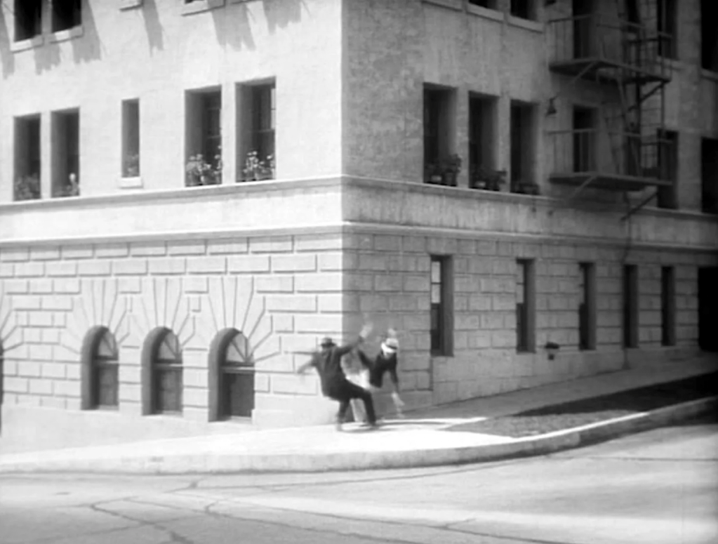 Fast Work is a 19 minute film short produced by Hal Roach Studios which starred Charley Chase and June Marlowe. The comedy centers around the main character who mistakes an escaped lunatic for the father of a girl he is interested in. The scene below is in front of Havenhurst Apartments at the corner of Whitley Avenue and Franklin Avenue. The short was also filmed at the Hal Roach Studios, 8722 Washington Blvd, Culver City and the Segundo Guasti Mansion, 3500 W. Adams Blvd., Los Angeles.