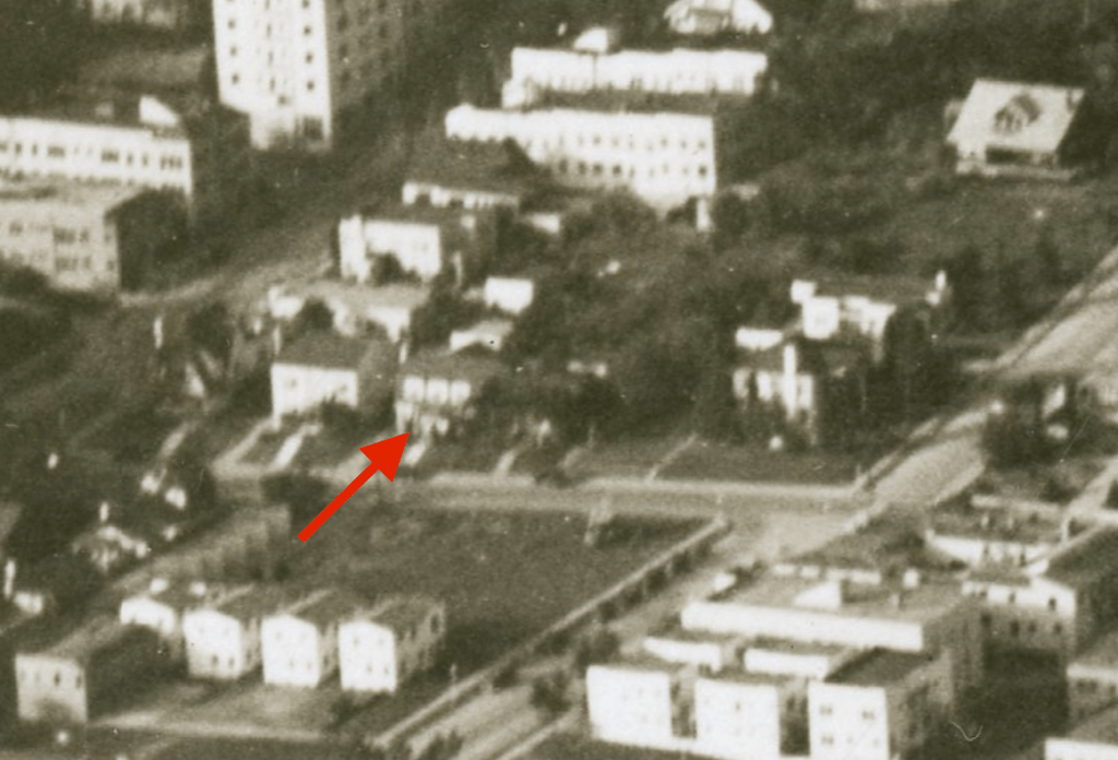 6551 Franklin Avenue was built in 1919 by builder Naldo F. Stokes who also built several other homes in the area including: 1905 Grace Avenue (1917), 6555 Franklin Avenue (1919), and 6561 Franklin Avenue (1919). The later two homes were both demolished in 2020. Below an aerial of the area in 1928, with the red arrow indicating the location of 6551 Franklin Avenue. The 6561 and 6555 Franklin Avenue residences are both to the left. 1905 Grace Avenue is on Grace Avenue which is the street on the right side of the photograph. Whitley Avenue is the street on the left side.