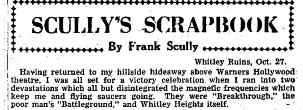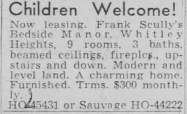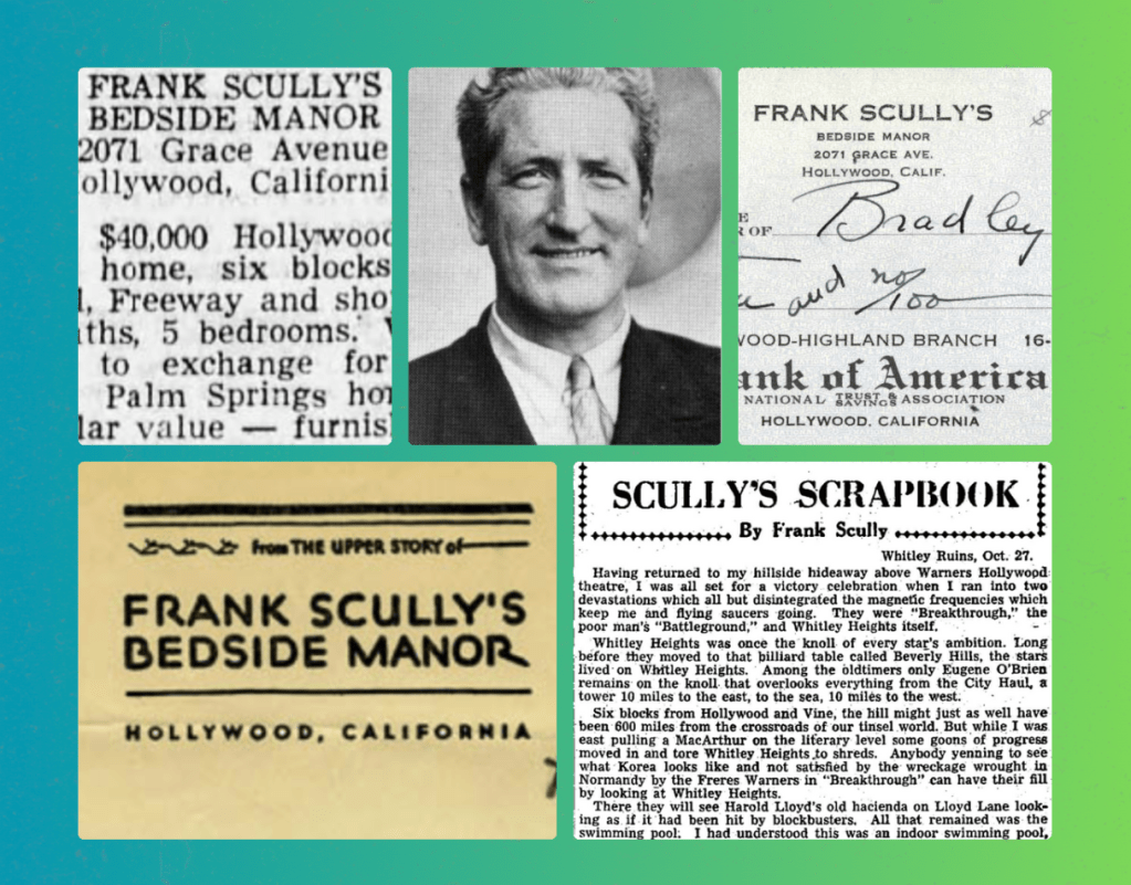 Scully then wrote another non-fiction book about flying saucers which claimed the Air Force confiscated several flying saucers from Venus, which caused another controversy in his life. In 1951, the Scully’s purchased a ranch in Palm Springs and began a rennovating project. In 1955, they decided to quit Hollywood and move to their ranch full-time. They decided to rent Bedside Manor and then sold it in 1958. Frank died at his Palm Springs ranch in 1964 at the age of 71.