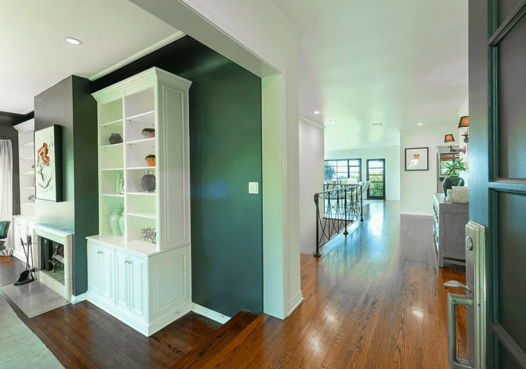 The front entry to the house is on the top floor which opens up to the main living area and a sitting room. When the house was last in 2023, the front sitting room was painted in green and has a fireplace.