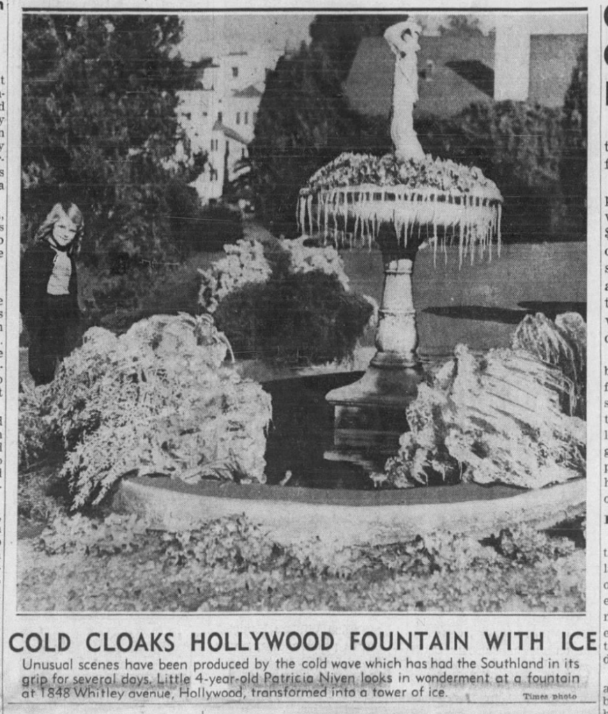 Whitley Gardens made news in 1937 (see below) when Los Angeles had a brutal winter and it was so cold that the fountain in the courtyard literally froze in January.