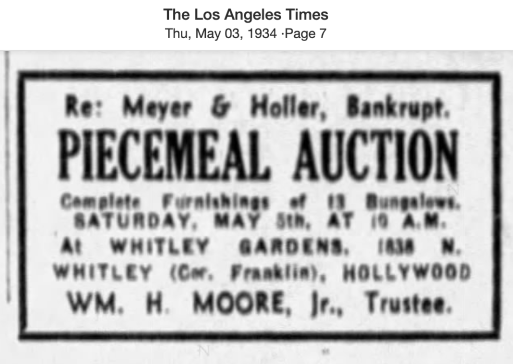 In 1934, Whitley Gardens went bankrupt and the homes went into foreclosure, with the owner selling the furniture from all of the buildings. However, a new owner purchased the complex saving complex.