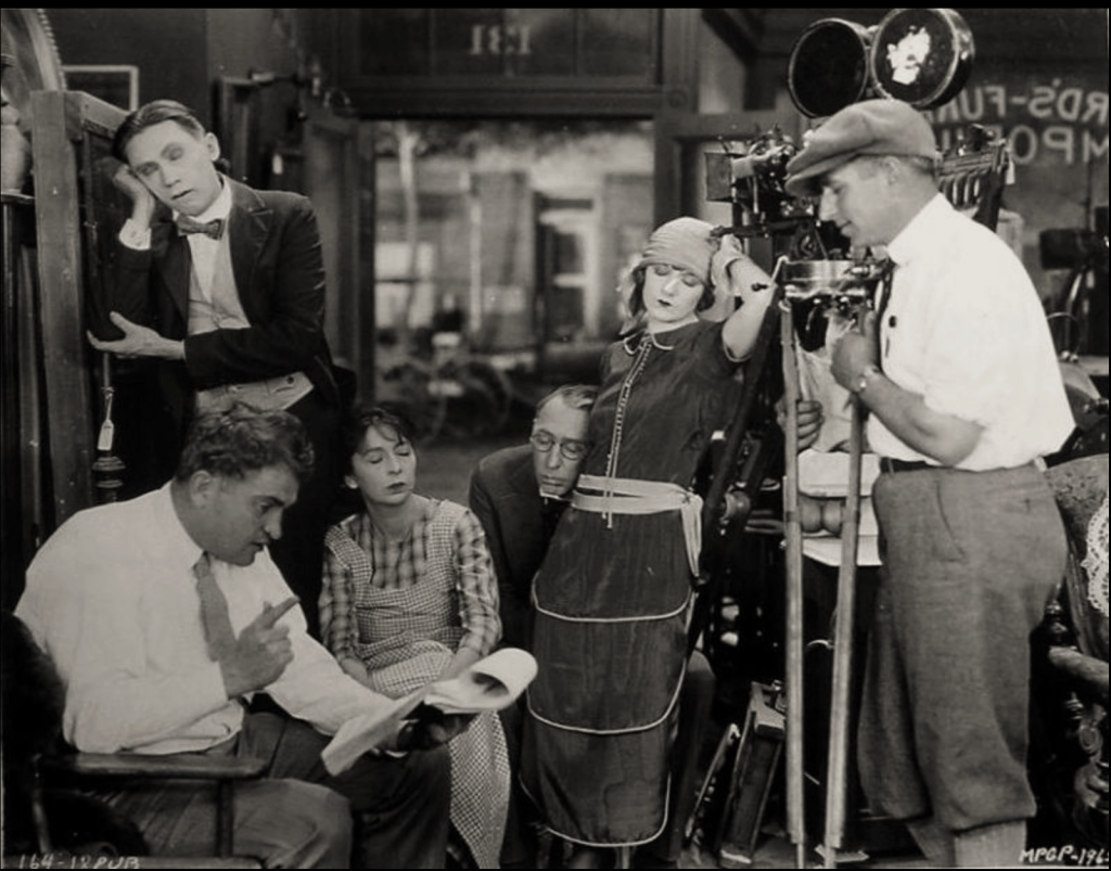 He also appeared in Universal Pictures’ “Snakeville” series. He was credited in over 450 films up until his death in 1947. Potel’s first talking picture was Melody of Love, starring Walter Pidgeon, made for Universal in 1928, and in the sound era he continued to work continuously and constantly, playing small parts and sometimes uncredited bit parts, all primarily comic roles due to his height (6.1 feet tall) and gawkiness. Below, left to right: director Edward F. Cline (with script), Victor Potel, Gale Henry, Tully Marshall, Viola Dana, and cinematographer John Arnold on the set of “Along Came Ruth” in 1924.
