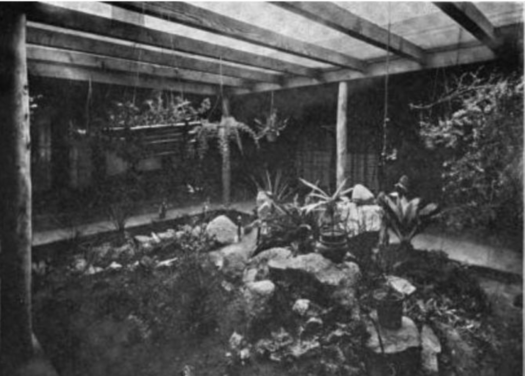 6705 Franklin Avenue was featured in “Architectural Review” and “Indoors and Out: The Homebuilders’ Magazine” in 1907. “The oddest houses in California are the bungalows, modeled after the adobe ranch houses the Spanish built in the olden days when they colonized in the southwest, They are always one story, low, long and simple, their sunny rooms all opening upon the secluded courtyard that is the prettiest place unimaginable”. Below, the patio was photographed showing a fountain containing goldfish and pond lilies which was located in the center of the property. The house featured three bedrooms on the leftside and a servants quarters on the right behind the kitchen.