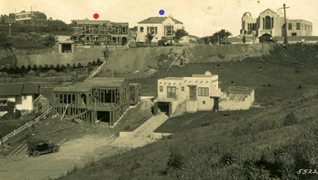 6793 Whitley Terrace was built in 1922 by architect Arthur S. Barnes for Jacob and Charlotte Miller who also built the house next door, 6697 Whitley Terrace at the same time. Below, this residence, indicated by the blue dot, was originally built as a one-story, five room bungalow home. In 1925, the Miller’s added a den and office underneath the dining room. Their other property, 6697 Whitley Terrace (red dot) was under construction and going to be built as one and a half stories with five rooms. The Millers put both properties up for sale after they were completed in September of 1922 but then decided to reside in this house while renting the house next door.