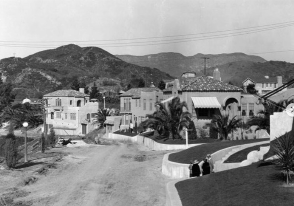 These two residences used to be in the heart of Whitley Heights before this area was bulldozed for the 101 Freeway during the 1950s. 6793 Whitley Terrace sat on the corner of Whitley Terrace and Iris Circle with the moorish home with a temple roof, 6787 Whitley Terrace was to its right. Houses on Fairfield Avenue were also being built below these homes.